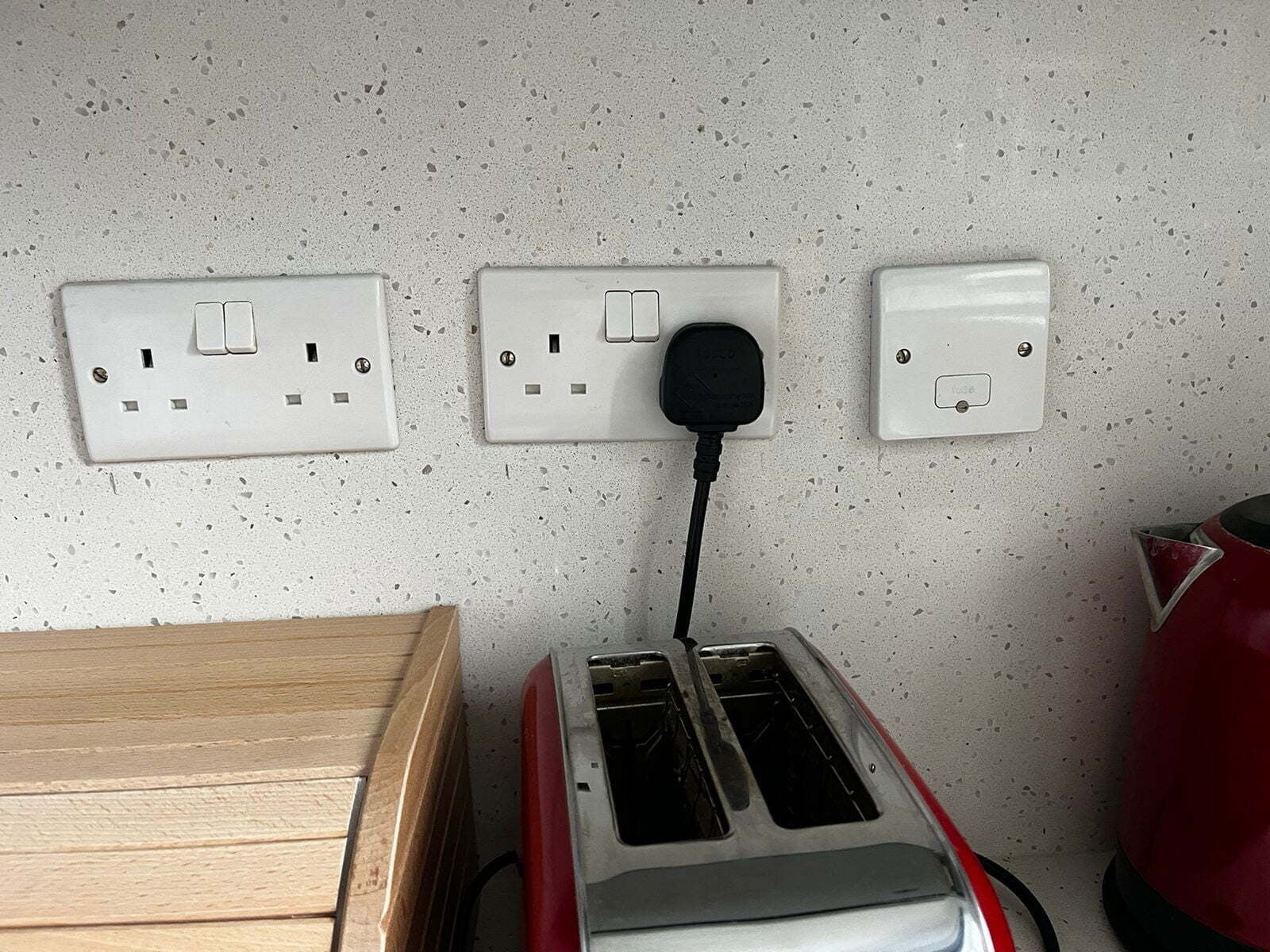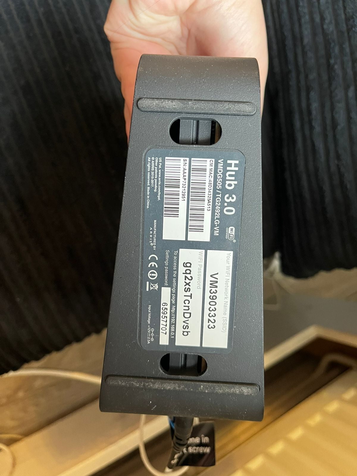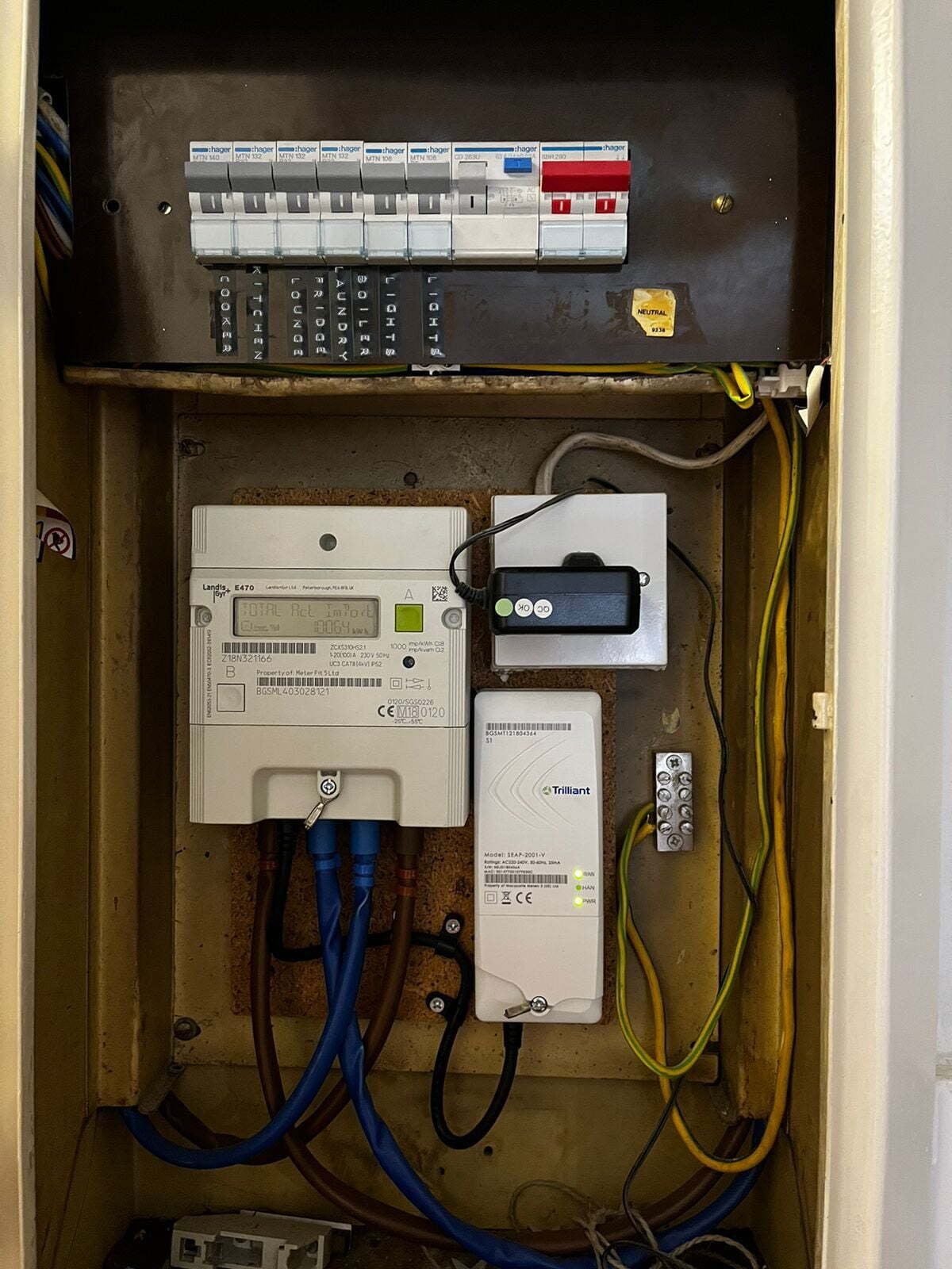The thermostat is linked to a hive hub (a white box), which is attached to the wifi hub (the black box), between the sofa and the window.